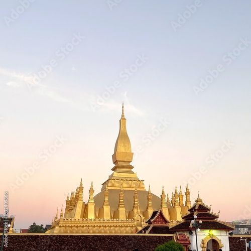 © AENOY, Fototapeta premium an important place located in the centre of vientiane and is also a popular tourist attraction. evening photos with a golden sky with sunlight and beautiful golden that luang