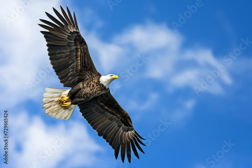 Obraz premium An impressive bald eagle soaring high with a blue sky backdrop, its wings...