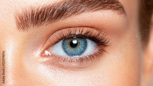 © Dulemegapixel, Obraz premium An impressive close-up photo of a blue eye with a sharp gaze, highlighting the vibrant iris details and long lashes, symbolizing perception and awareness.