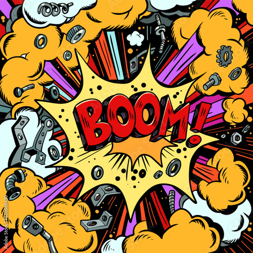 © rogistok, Fototapeta premium An incredible and sudden event that brings chaos. Thunder of upcoming discounts and sales of services and goods. The effect and the inscription BOOM with many elements.