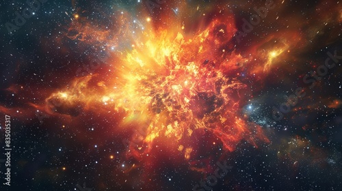 Naklejka premium An incredible supernova explosion against the backdrop of the Milky Way, vibrant hues of red, orange, and yellow spreading out, surrounding star clusters and nebulae highlighted by the explosion's