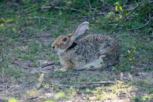 Fototapeta premium An Indian hare is seen resting on the ground. This medium-sized hare has long...