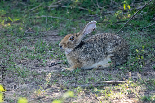 Fototapeta premium An Indian hare is seen resting on the ground. This medium-sized hare has long...