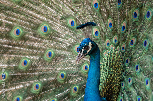 Naklejka premium An Indian peafowl (Pavo cristatus) showing its colorful feathers