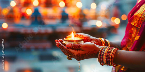 Fototapeta premium An Indian woman with a candle in her hand. The woman is wearing a red sari.