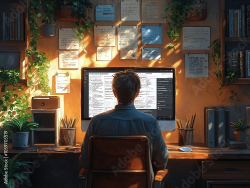 © Northframe Studio, Fototapeta premium An individual in a home office interacting with an AI personal assistant displayed on a computer screen, organizing their tasks, reminders, and calendar