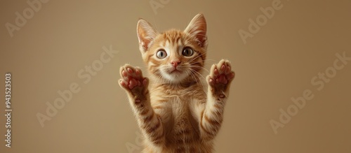 © HN Works, Fototapeta premium An indoor scene with a young ginger cat standing and holding an advertisement in its paws against a copy space image
