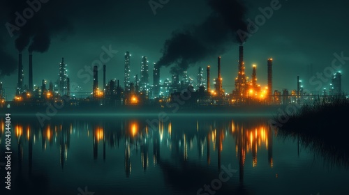 © Alienmarsh, Naklejka premium An industrial complex at night with smoke stacks spewing out black smoke, reflected in the water.