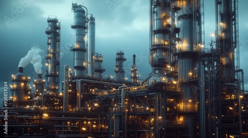 © musa, Fototapeta premium An industrial complex with tall towers and pipes, lit up at night.