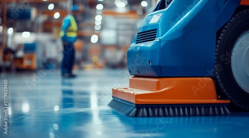 Obraz premium An industrial floor cleaner cleaning the concrete surface at a commercial...