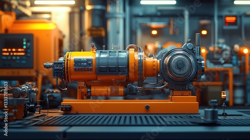 © iam, Fototapeta premium An industrial machine is shown in a brightly lit workshop scene