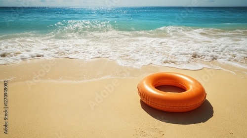 © Suphawan, Naklejka premium An inflatable ring resting on the warm golden sand of a beach, with the ocean gently lapping at the shore in the background