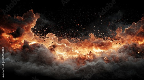 © Babb, Naklejka premium An intense explosion unleashes fiery clouds and billowing smoke against a contrasting dark background, creating a visually striking and chaotic atmosphere