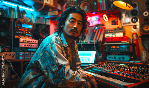 © Bartek, Obraz premium An intense portrait of an Asian rapper immersed in his music production, surrounded by studio equipment and a neon-lit ambiance, capturing the raw energy and passion of hip-hop artistry.