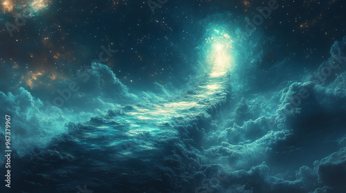 Fototapeta premium An interstellar crystal stream winding its way around a glowing planet,