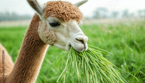 © Wimon, Obraz premium An intimate shot of a grazing alpaca, with blades of green grass slipping through its teeth, creating a calm and serene pastoral scene.