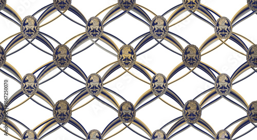© Digitraz, Fototapeta premium An intricate, elegant seamless pattern features a repeated geometric design with intertwined gold and dark blue lines, creating a sophisticated and luxurious visual texture.