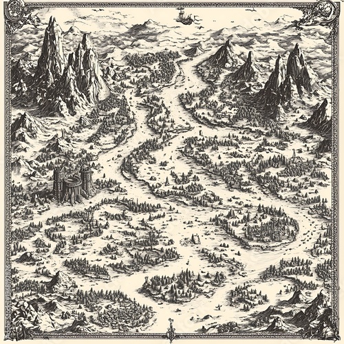 © Najeeb, Naklejka premium An intricate, hand-drawn map of a fantastical kingdom, with winding rivers, towering mountains, and mysterious forests, showing every detail of this imaginary land