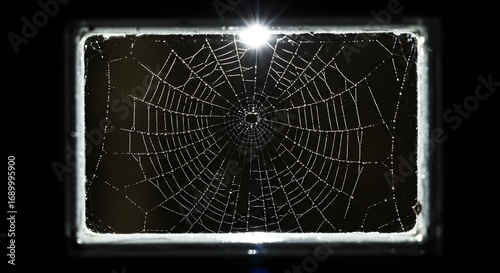 © Afif, Naklejka premium An intricate spiderweb, shimmering with dew, brilliantly illuminated from above within a dark, rectangular opening.