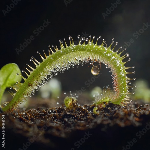 Naklejka premium An Intriguing Close-Up of an Exotic Carnivorous Plant with a Tiny Insect on Its Leaf
