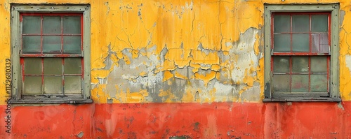 Naklejka premium An intriguing image showcasing the weathered facade of an old building with vibrant orange and yellow peeling paint, featuring two vintage windows side by side, capturing a sense of timeless decay