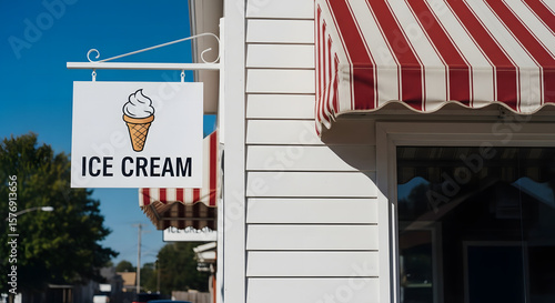 © Tauros, Naklejka premium An inviting ice cream shop sign hangs on a white building with a red and white striped awning beckoning customers inside.