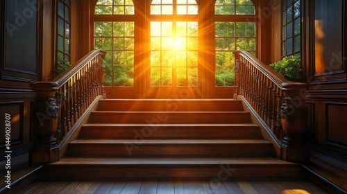 © Linus, Obraz premium An inviting wooden staircase bathed in warm sunlight, offering a beautiful view.