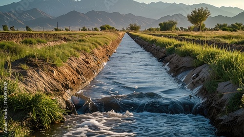 © visoot, Fototapeta premium An irrigation canal flowing through a field with mountains in the background.