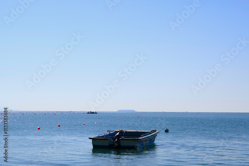 © QyuKim, Naklejka premium An island that looks small in the distance and a boat that you see right in front of you
