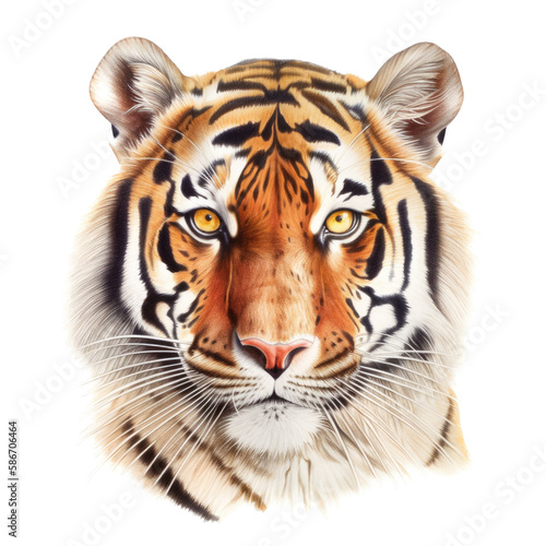 © Purple Penguin GFX, Naklejka premium an isolated Bengal tiger face portrait, face, stalking prey, fierce jungle-themed watercolor painting illustration on a transparent background in PNG. Generative AI