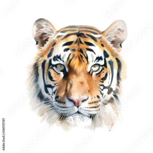 © Purple Penguin GFX, Naklejka premium an isolated Bengal tiger portrait, face, stalking prey, fierce jungle-themed watercolor illustration on a transparent background in PNG. Generative AI