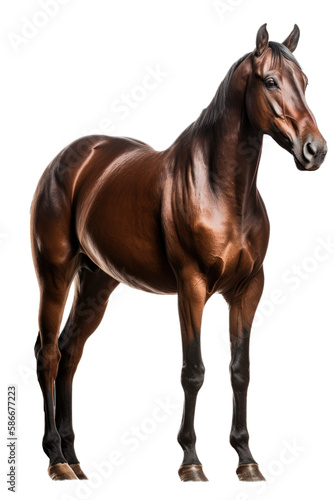 © Purple Penguin GFX, Obraz premium an isolated dark brown and black horse running, jumping, side view portrait, equestrian-themed photorealistic illustration on a transparent background cutout in PNG, Generative AI