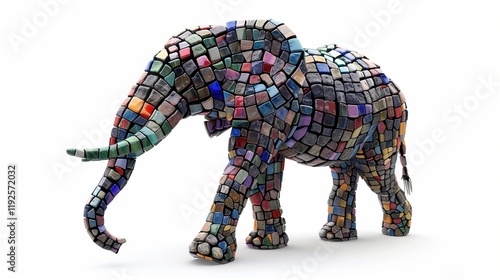 © Arfana, Obraz premium An isolated elephant statue made from multicolored stones, captured in a lifelike pose on a white background.