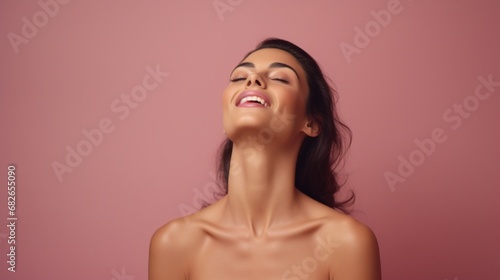 © PrismCraft, Obraz premium An isolated full-body portrait of a happy, impressed woman with her hands on her head and her mouth open against a pink background.