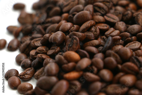 © Graham, Naklejka premium An isolated pile of roasted coffee beans on a white background surface