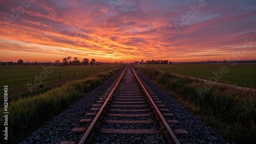 © AkuAku, Fototapeta premium An isolated train track stretching towards a radiant sunset, surrounded by flourishing fields glowing in the evening light.