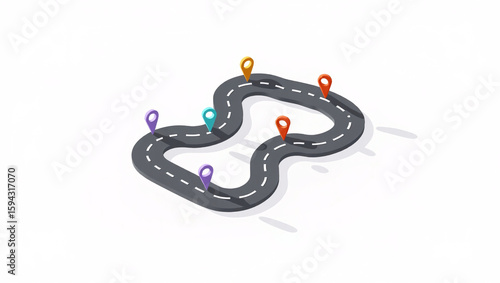 © Ben, Obraz premium An isometric winding road with colorful location pins marking points along its path.