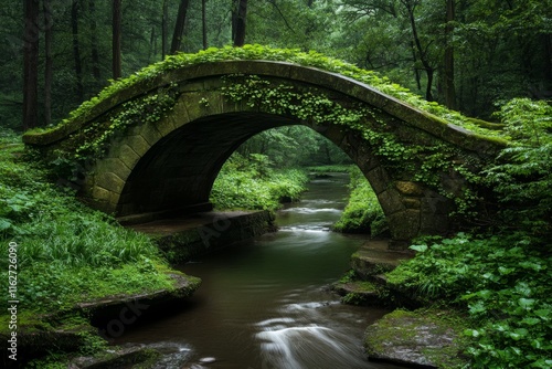 © Sanchai, Fototapeta premium An ivy-covered bridge over a small canal, blending seamlessly into the surrounding natural environment