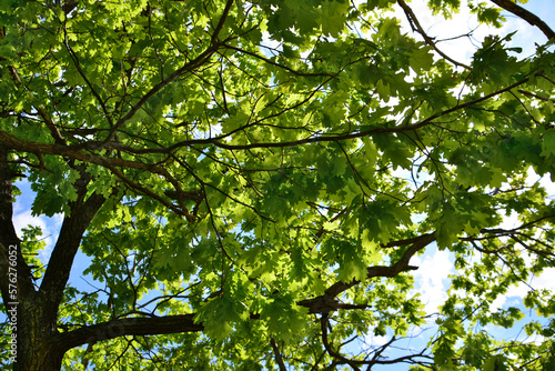 © Irina, Obraz premium An oak tree with green leaves and the sun shining through them isolated