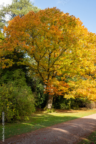 © drew, Naklejka premium An oak tree with leaves turning yellow in their natural way during autumn or fall that happens yearly. The annual seasonal change is part of natures cycle and creates beautiful colors in woodlands