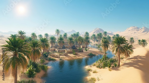 © Larysa, Obraz premium An oasis with palm trees and mud houses in the desert on a hot summer day