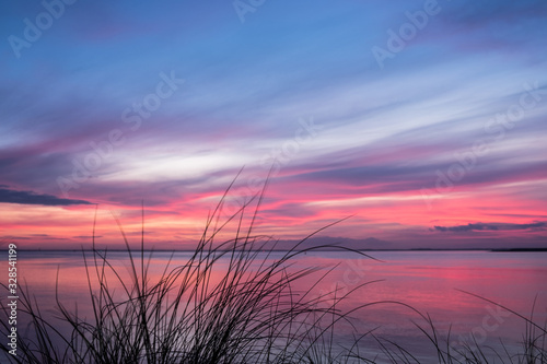 Fototapeta premium An ocean sunset dramatic sky beyond grass silhouette