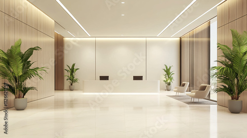 © mahamad, Fototapeta premium An office lobby with a pristine white wall.