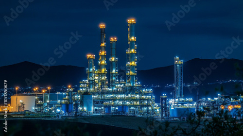 Fototapeta premium An oil and gas plant shines brightly at night, highlighting the energy industry's role in a smart city. This symbolizes how technology can help us use energy wisely and sustainably.