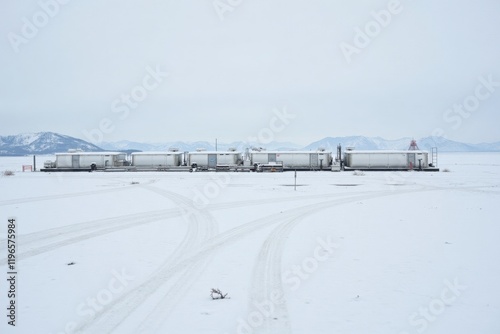 Obraz premium An oil depot on a snowy plain, with snow-covered tanks and pipelines. The background shows a gray sky and distant snowy mountains