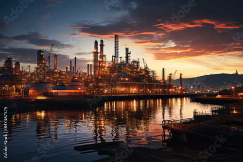 © Sebastian, Fototapeta premium An oil refinery plant operates in the desert during evening twilight, symbolizing energy production in the petroleum gas industry. Generative AI.
