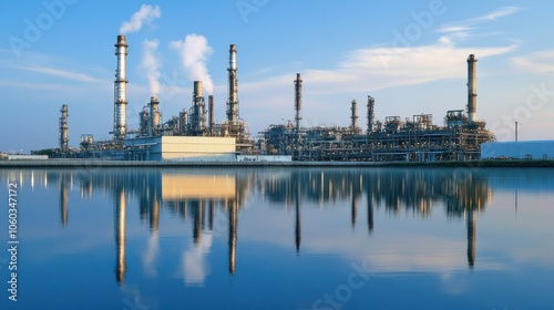 Naklejka premium An oil refinery plant reflected in calm water, blending serene natural beauty...