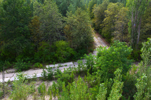 © serg11111, Obraz premium An old abandoned road in the exclusion zone. Dead military unit. Consequences of the Chernobyl nuclear disaster, August 2017.