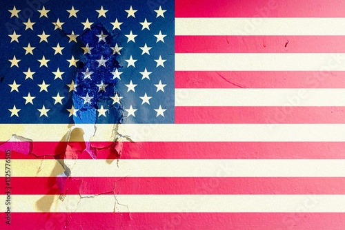 © Gem, Naklejka premium An old American flag painted on a cracked wall creates a textured and patriotic background.