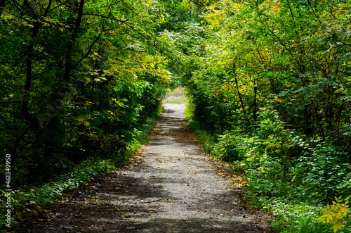 © ket167600, Fototapeta premium An old asphalt road runs through a deciduous forest.